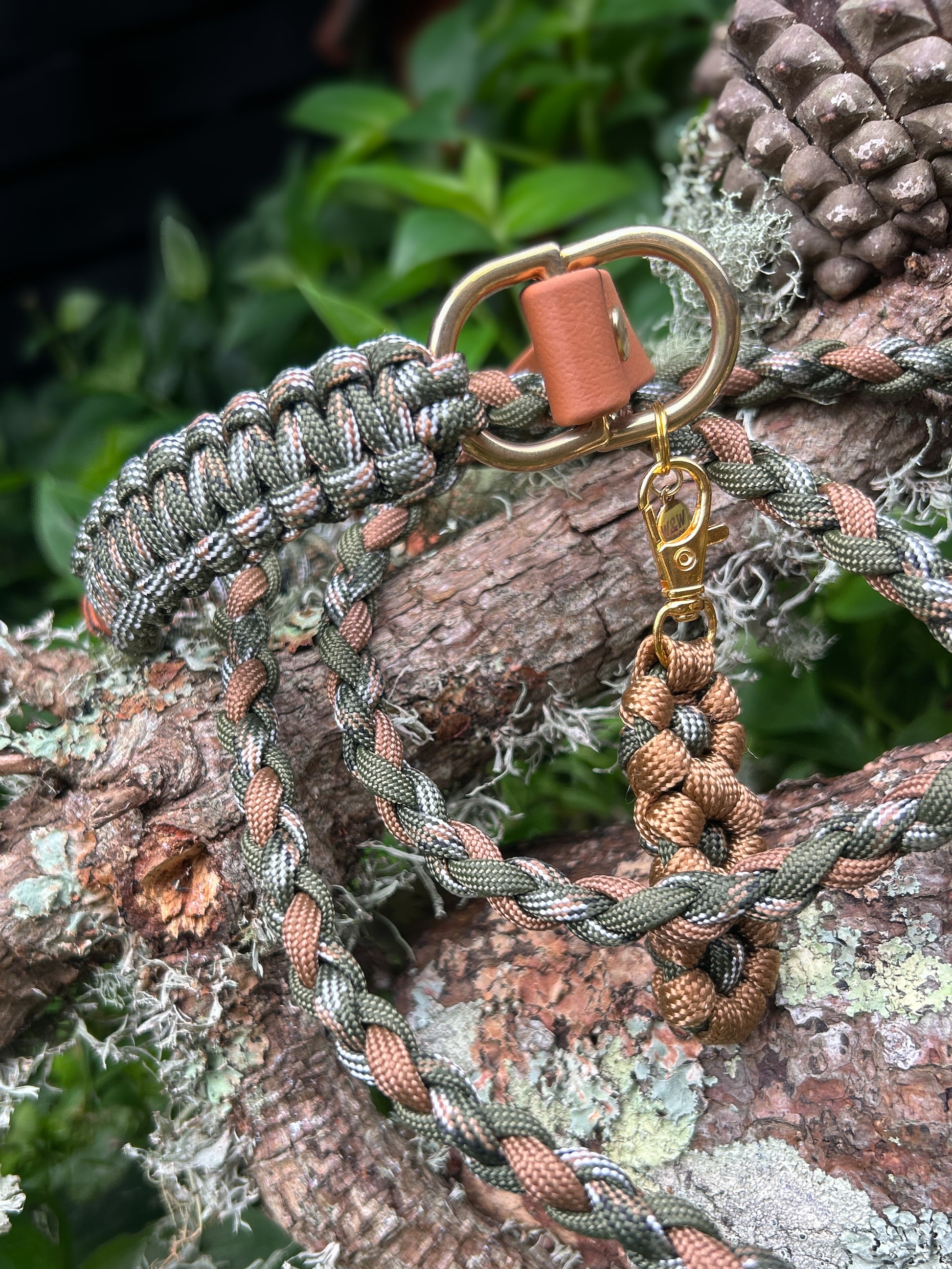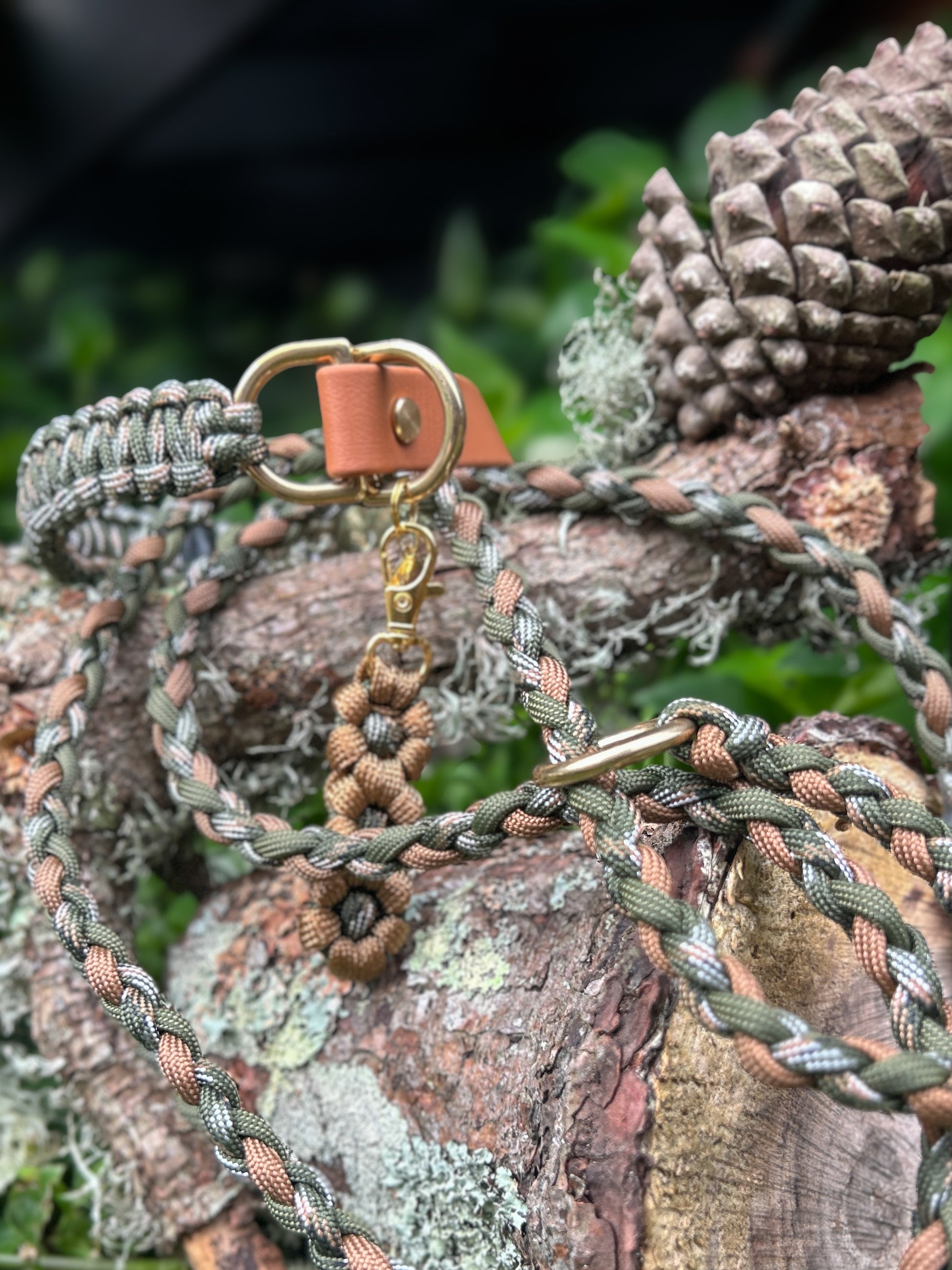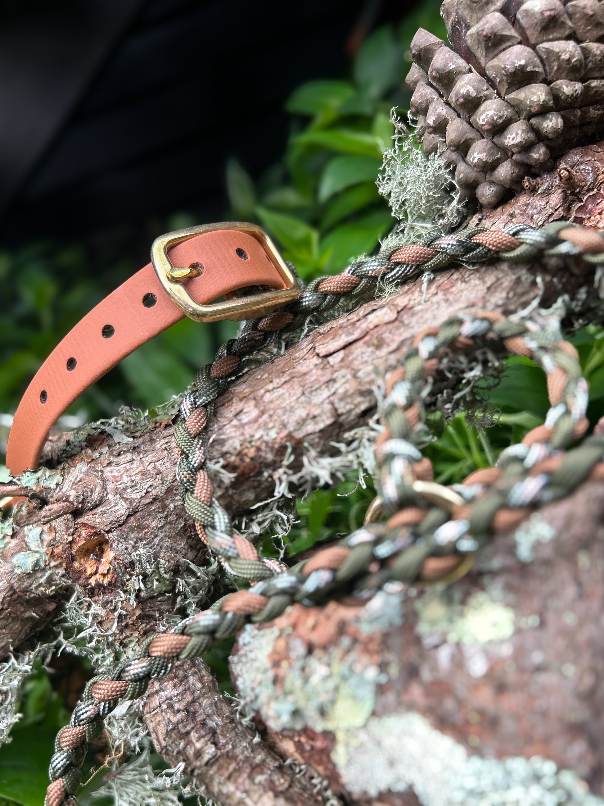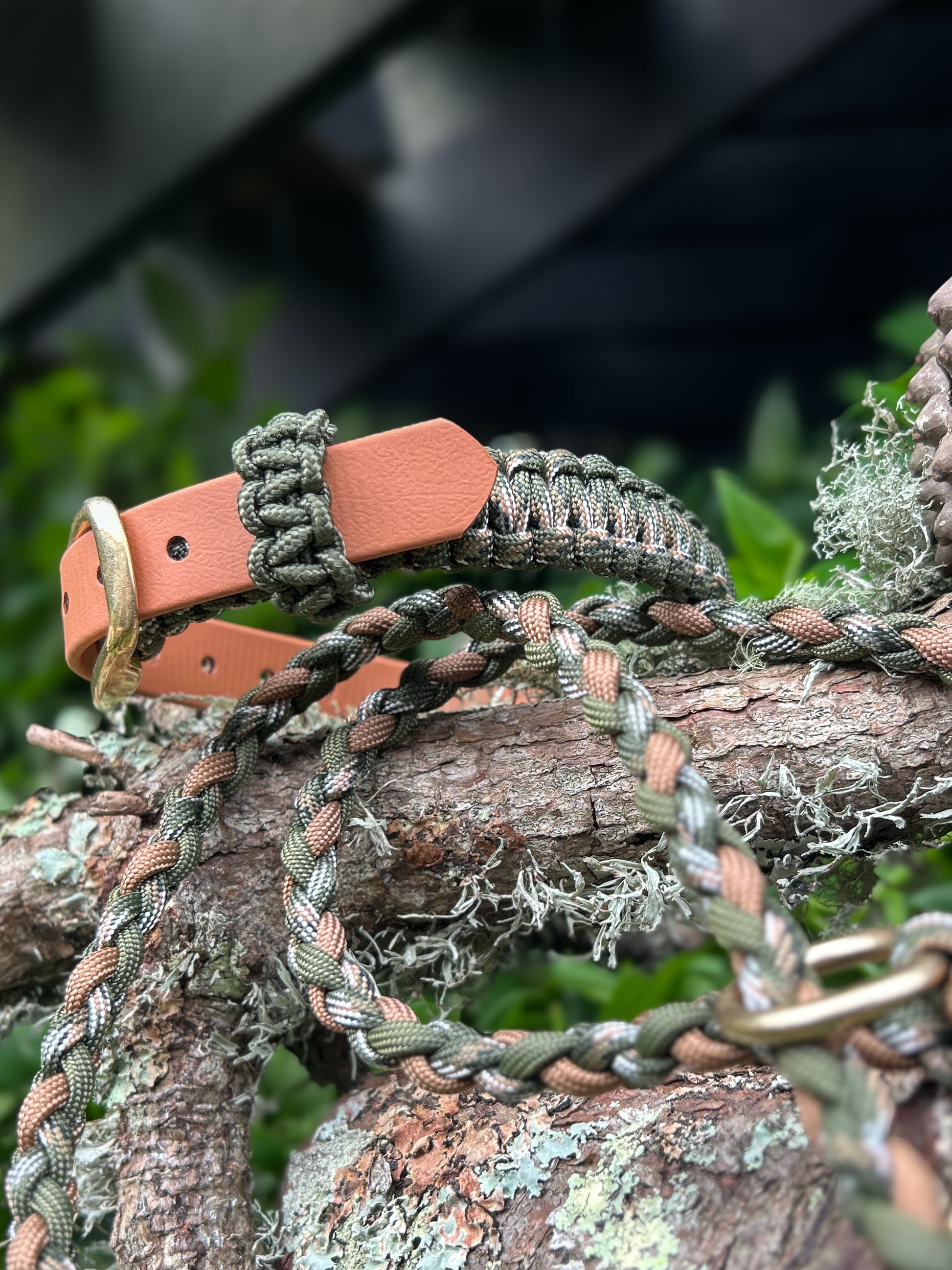 ¾" hybrid collar – camo paracord, light brown BioThane, brass hardware. Small 27–37cm + 1.3m trifecta lead with matching bloom charm.