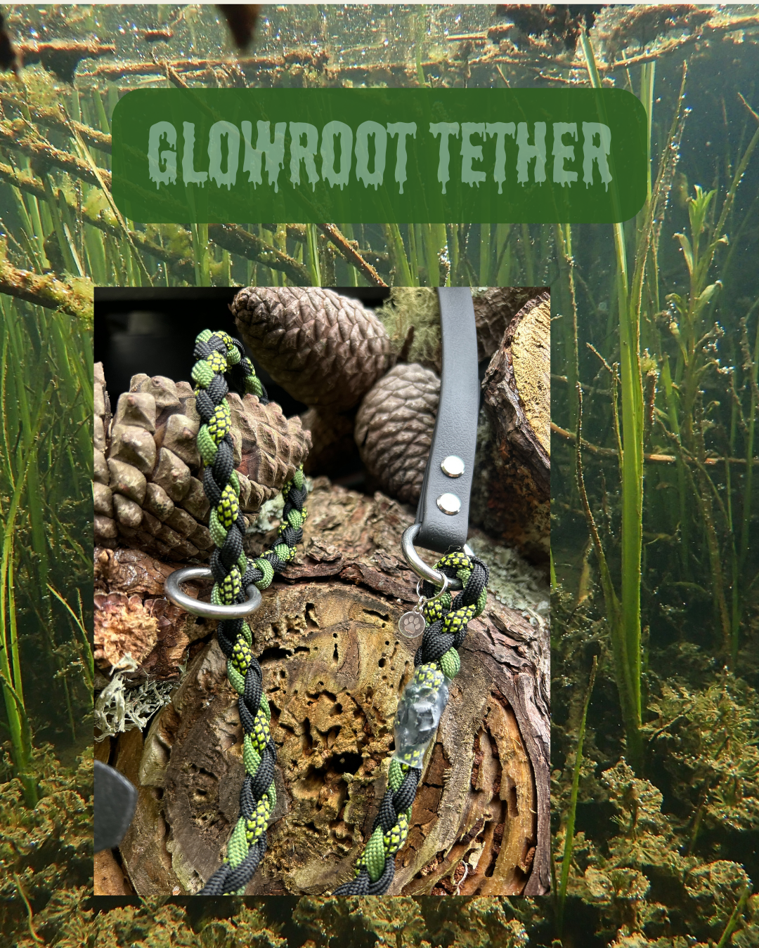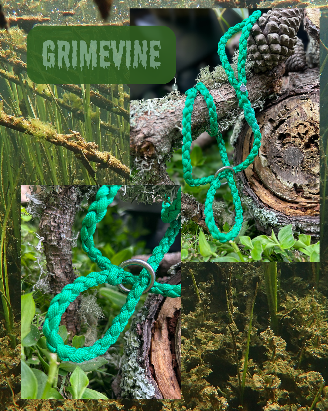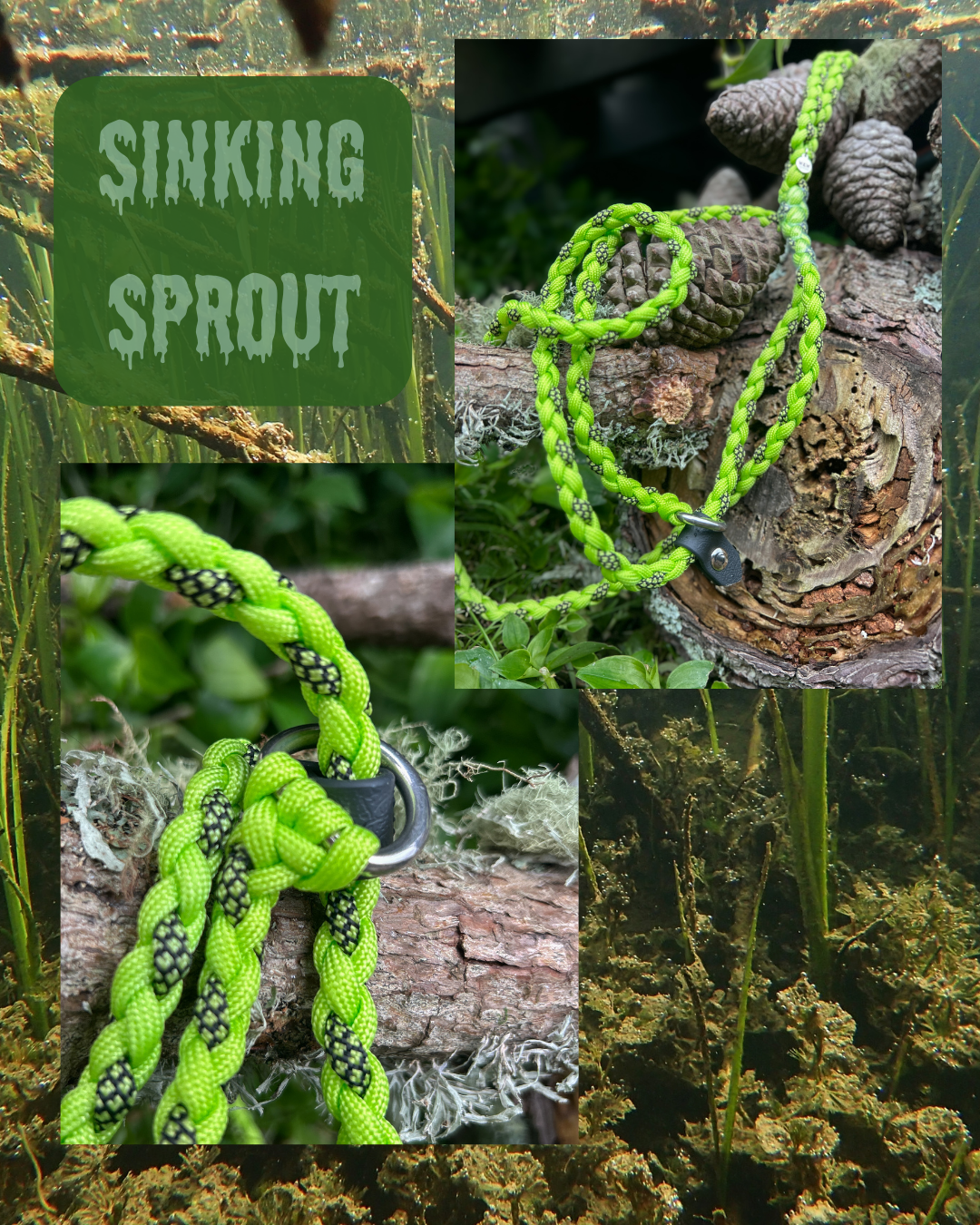1.5m old-style paracord slip lead – fluoro green with green scale peekaboo, stainless steel D-ring. A ghost of styles past – reborn in the glow of the forest.