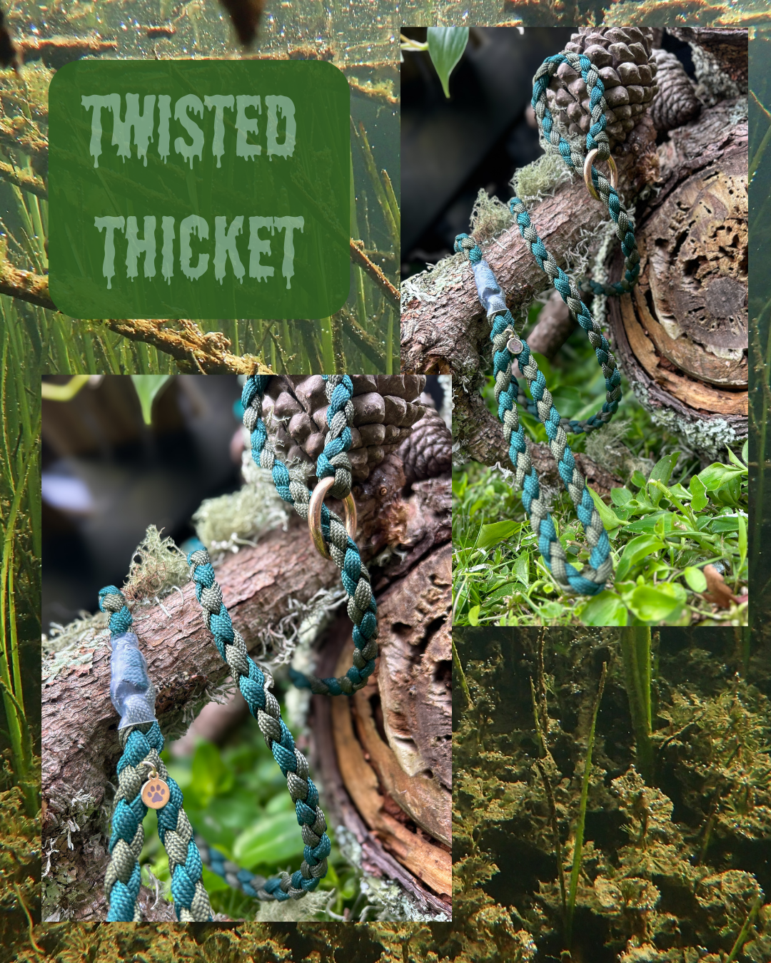 1m paracord slip lead spiral pattern – emerald & army green, brass hardware. A winding path through the underbrush.