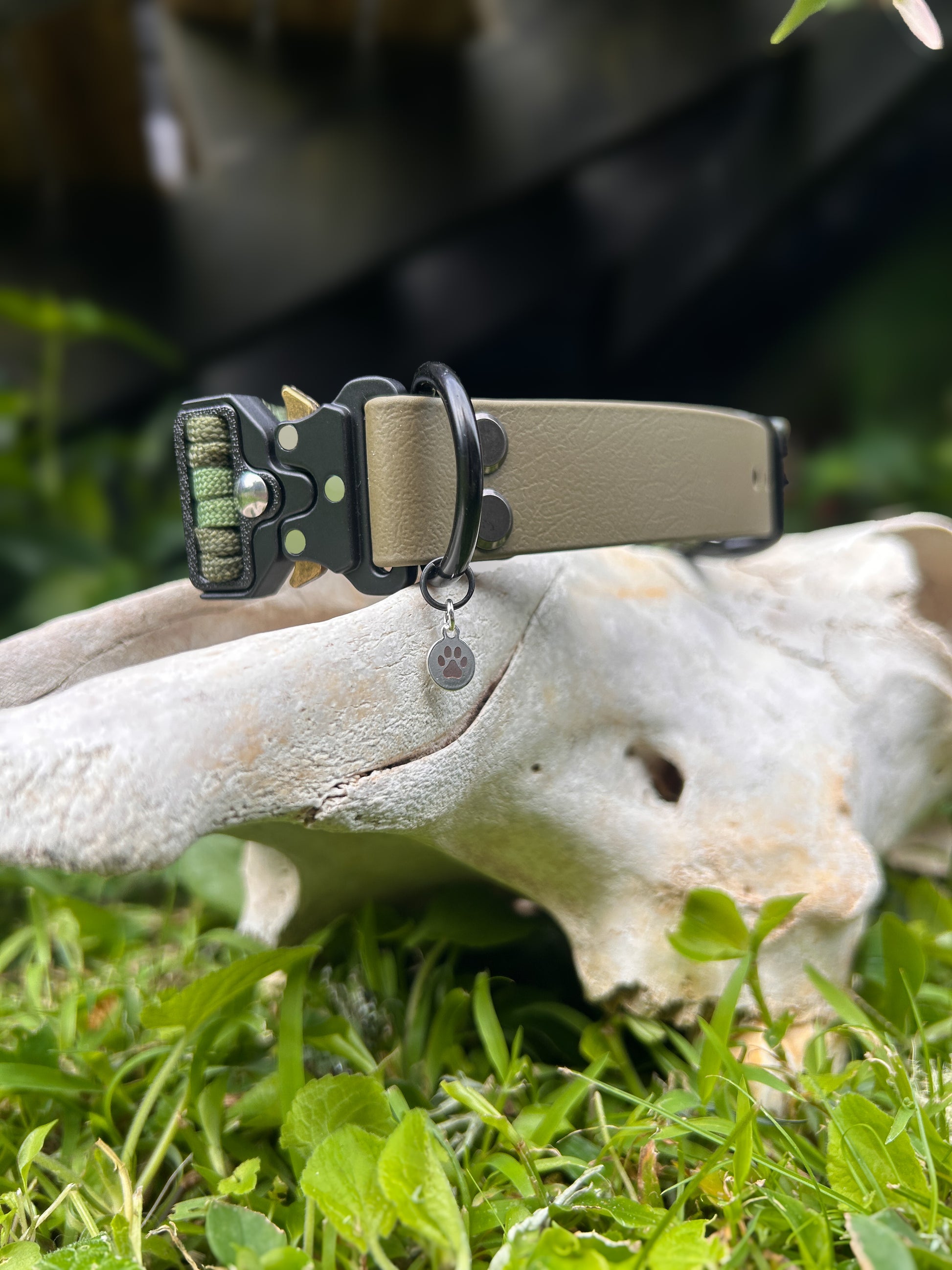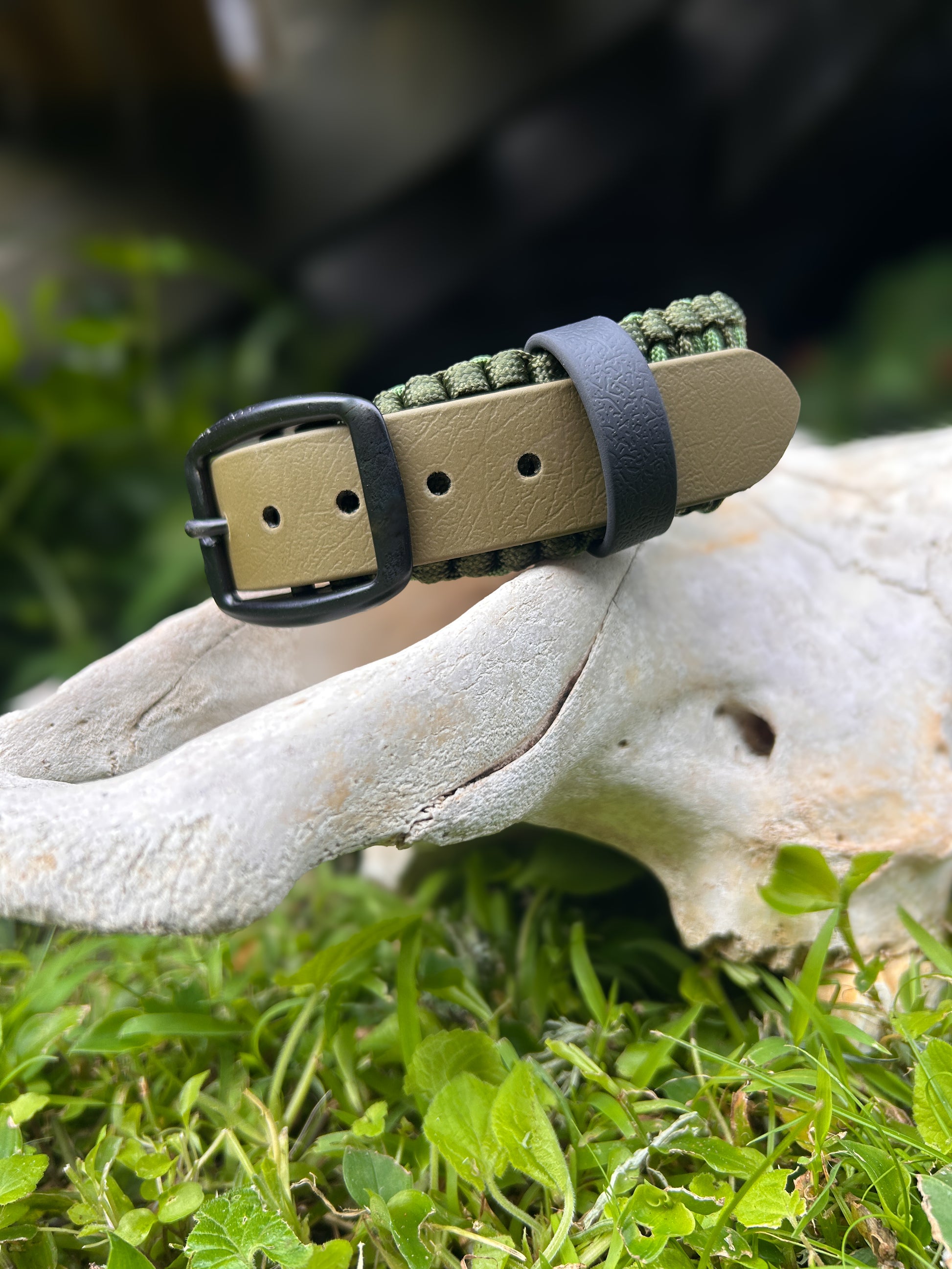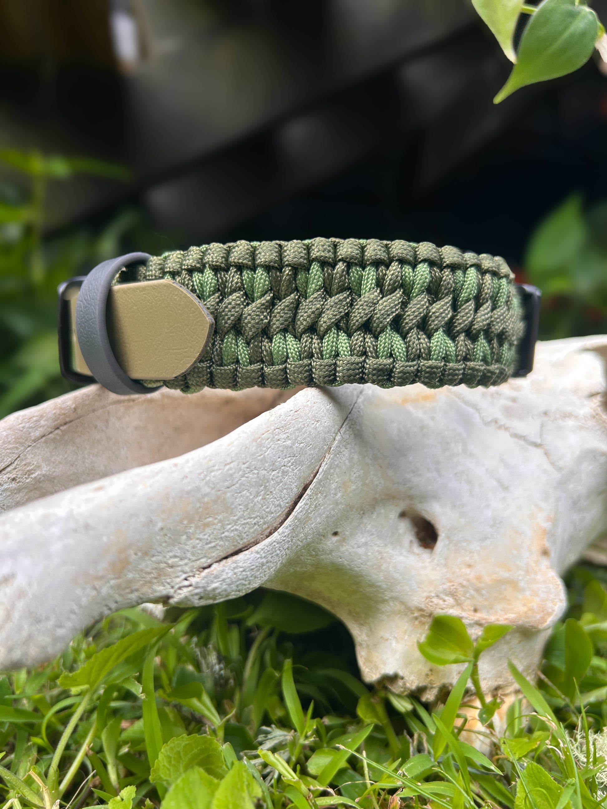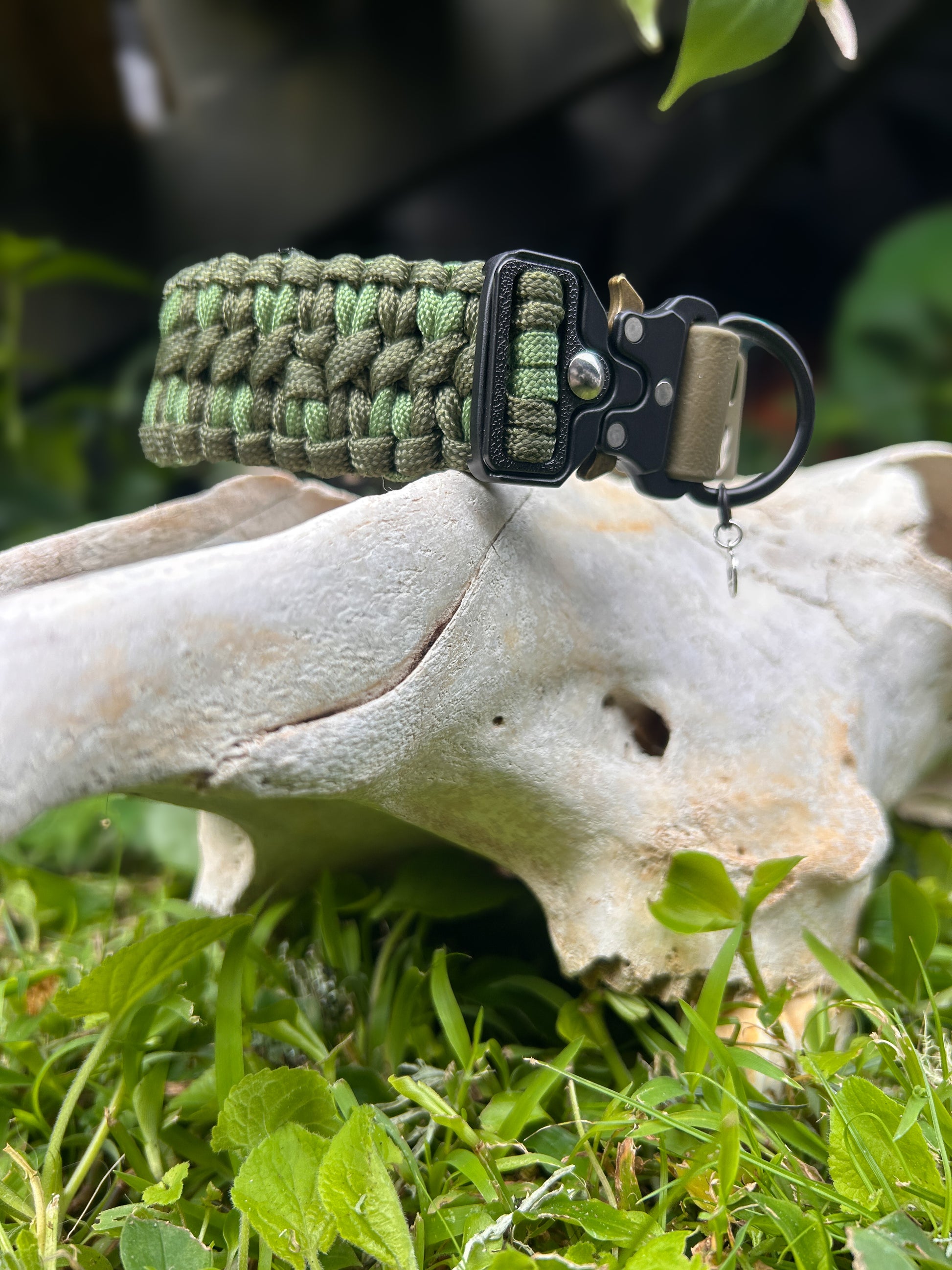 1" Hybrid – black hardware, quick-release buckle, army green & moss paracord. Medium 34–44cm. Moss paracord is running low! This may be your last chance to score a collar with a mossy vibe.