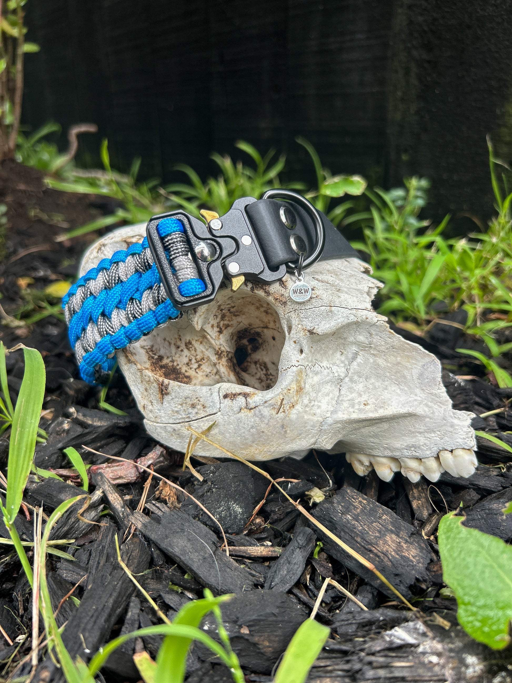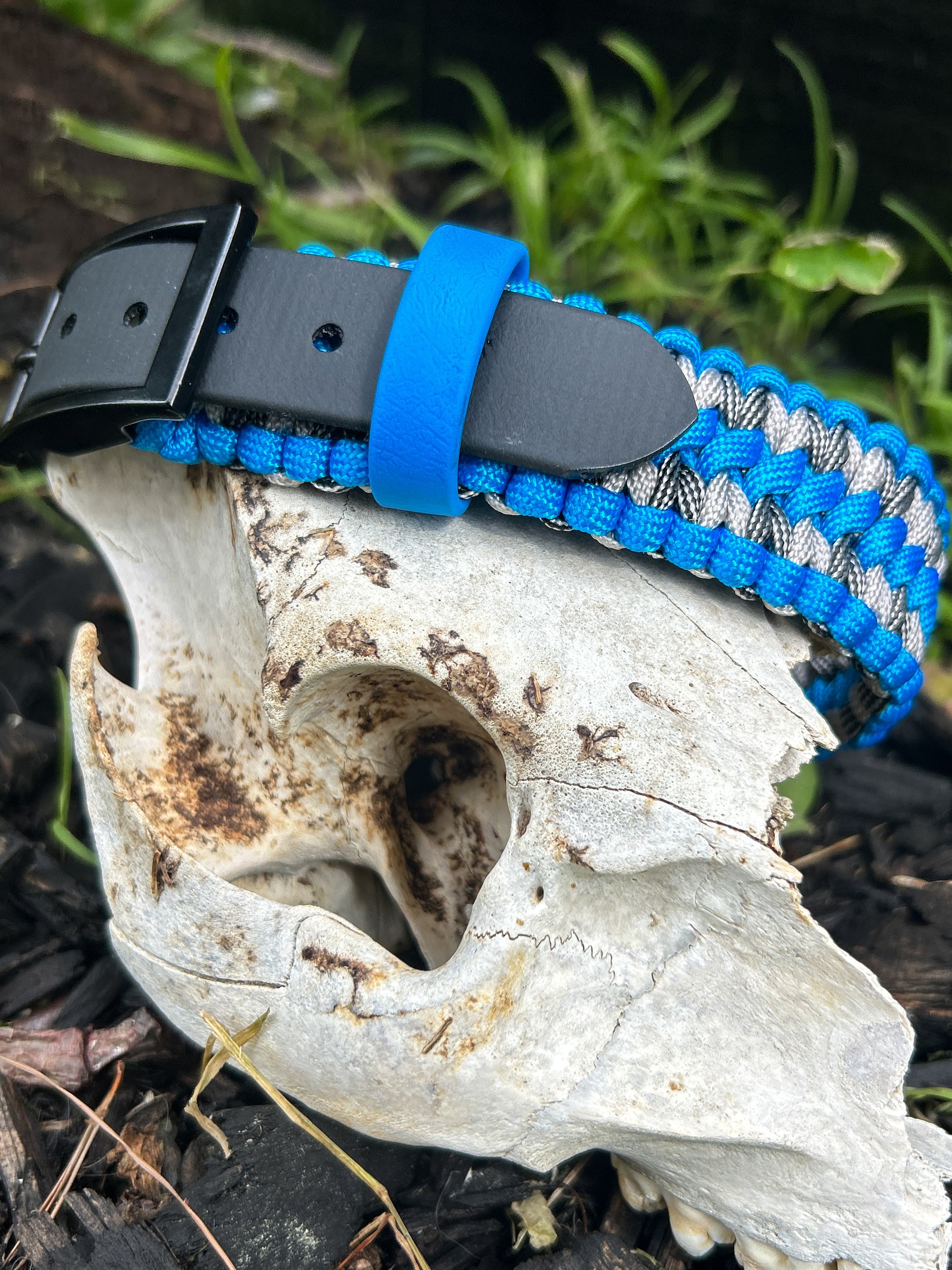 1" hybrid collar – black Biothane, grey, black stripe & sky blue paracord braid – quick-release black hardware – Medium 36–46cm