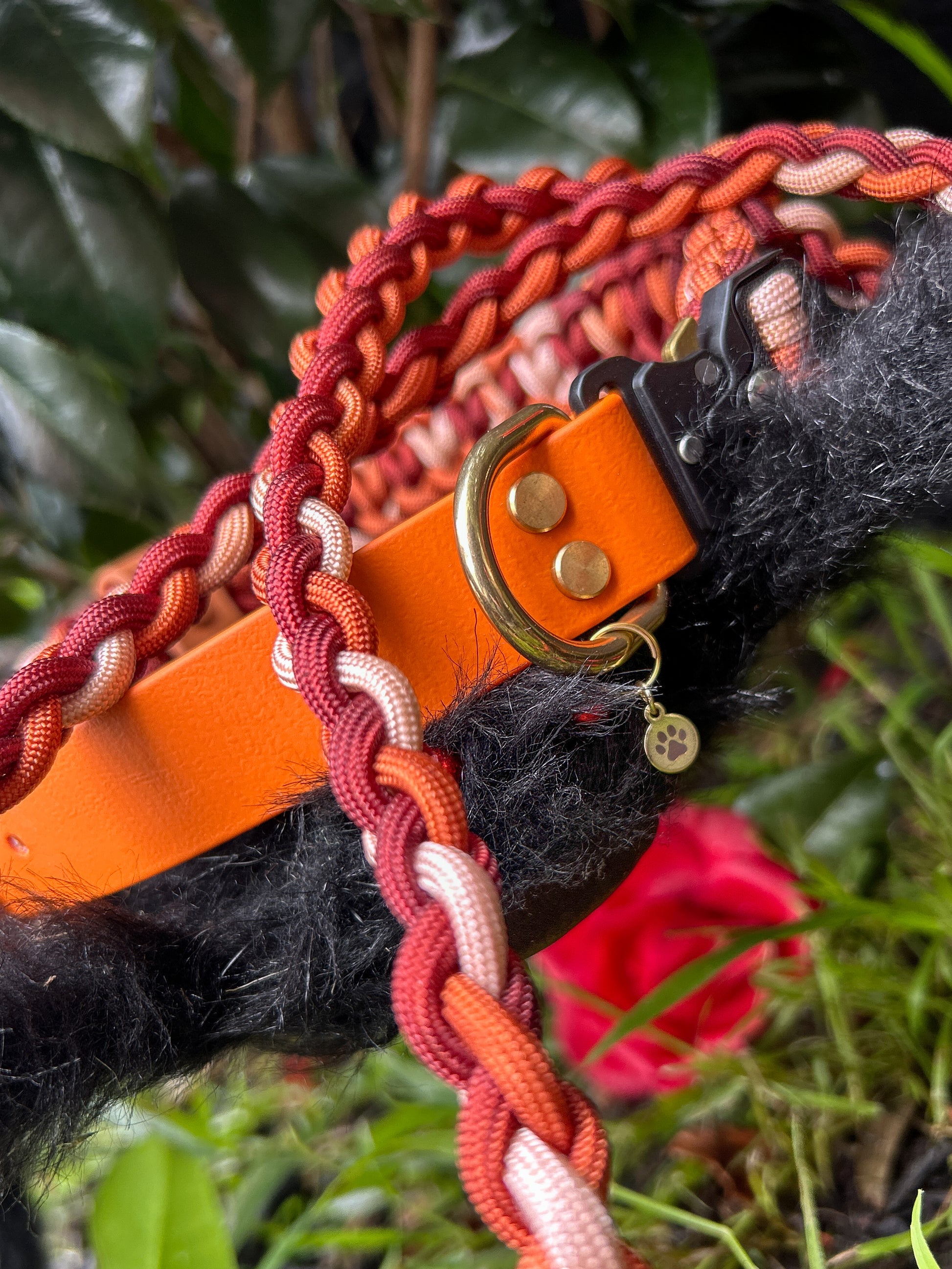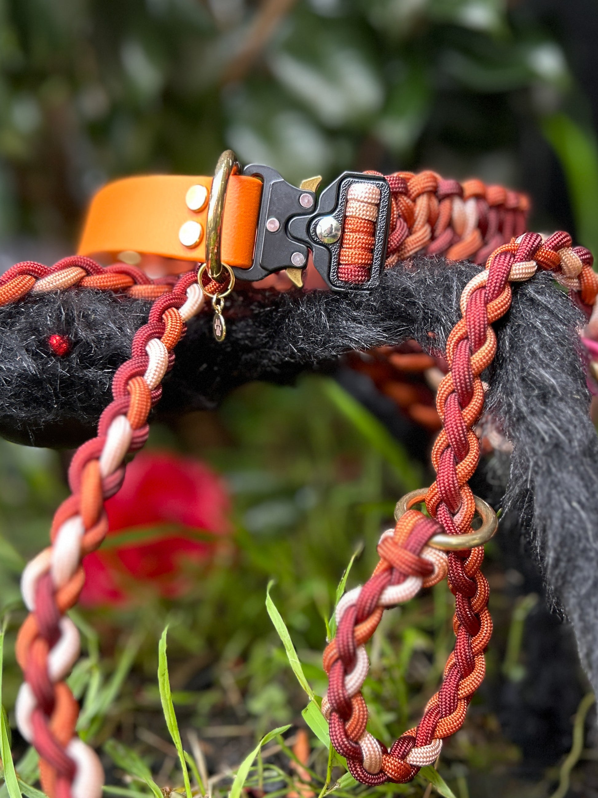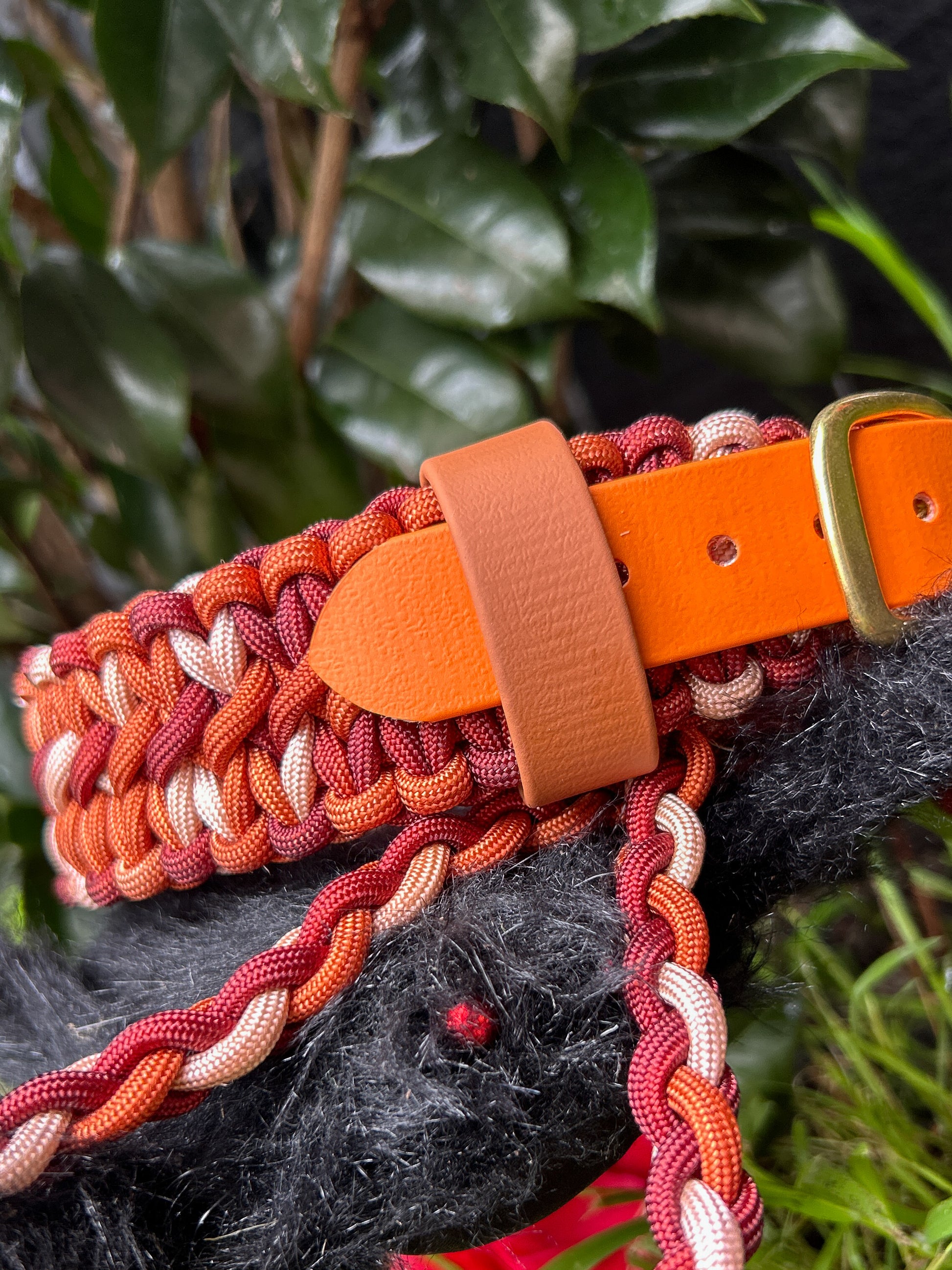 1" Hybrid collar – ombre warm red paracord, burnt orange BioThane, brass hardware & black quick-release buckle + matching shorter multi-function slip lead. Large 43-55cm.