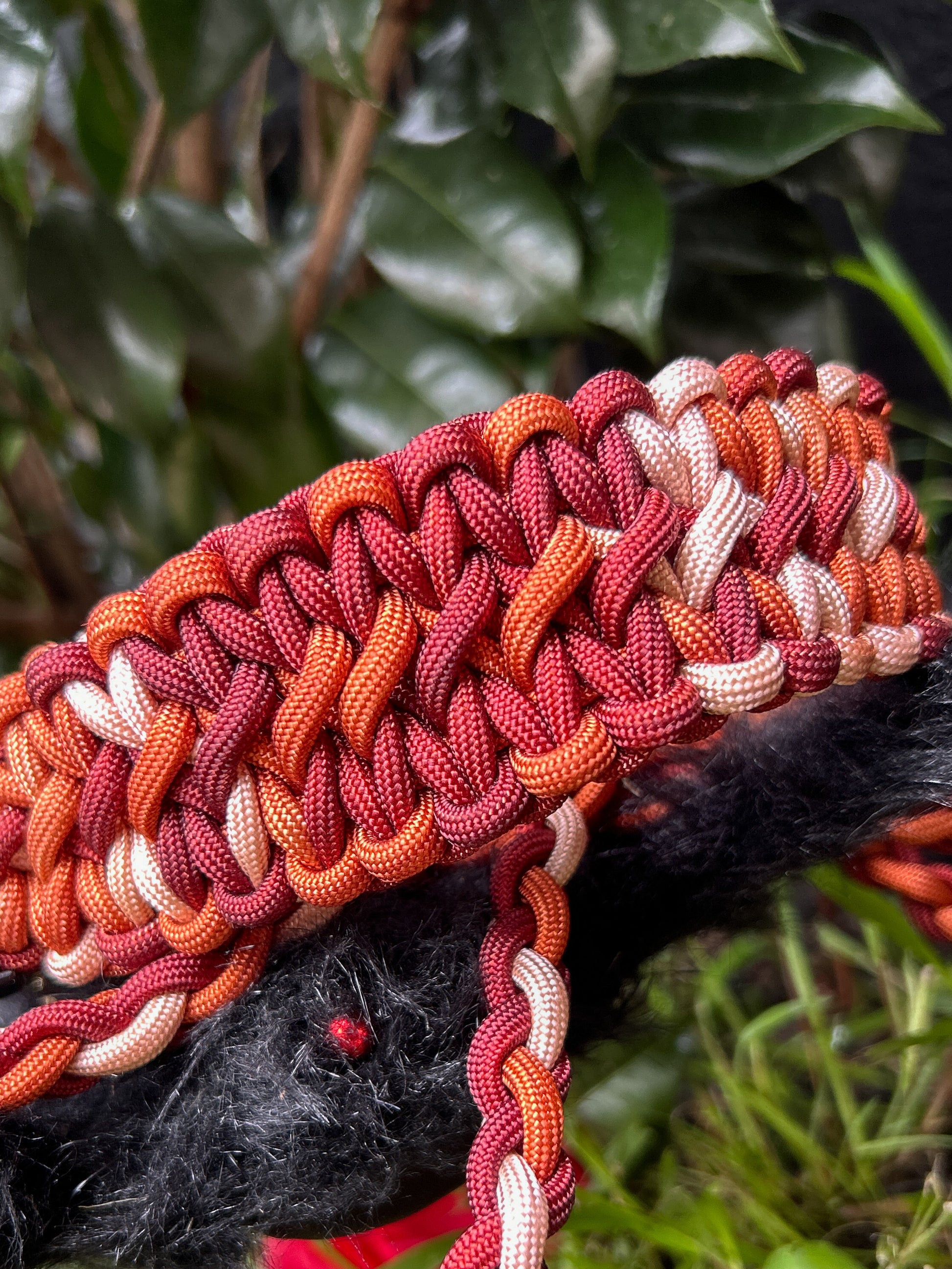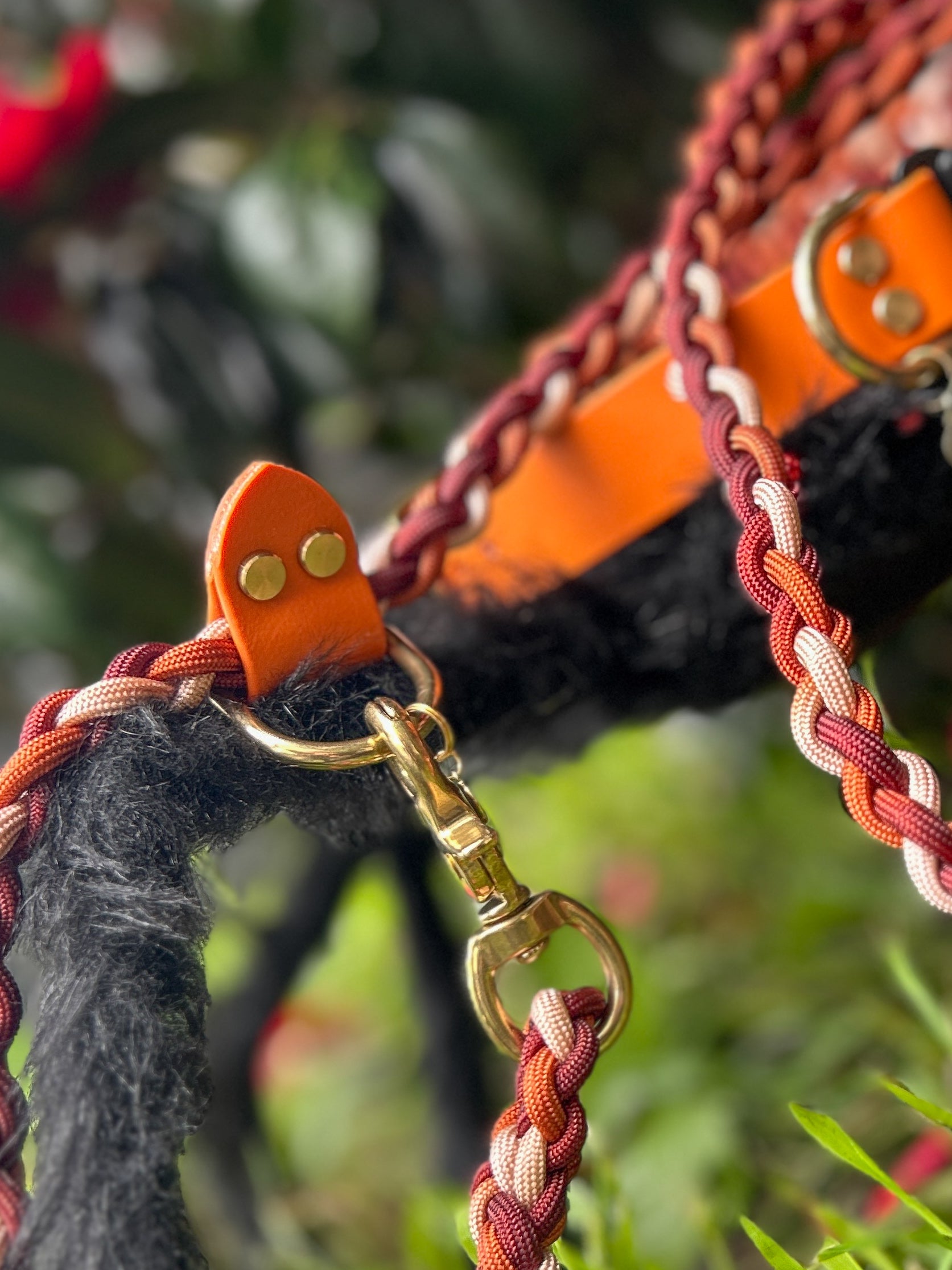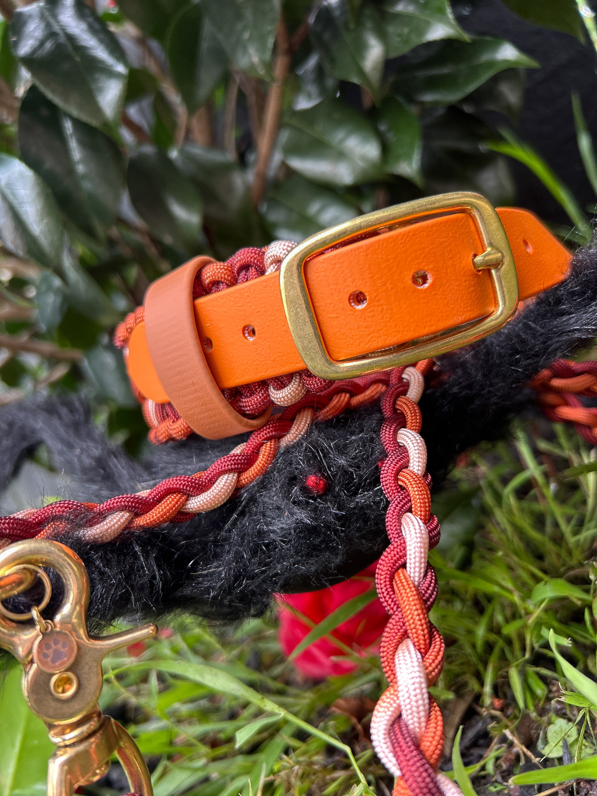 1" Hybrid collar – ombre warm red paracord, burnt orange BioThane, brass hardware & black quick-release buckle + matching shorter multi-function slip lead. Large 43-55cm.