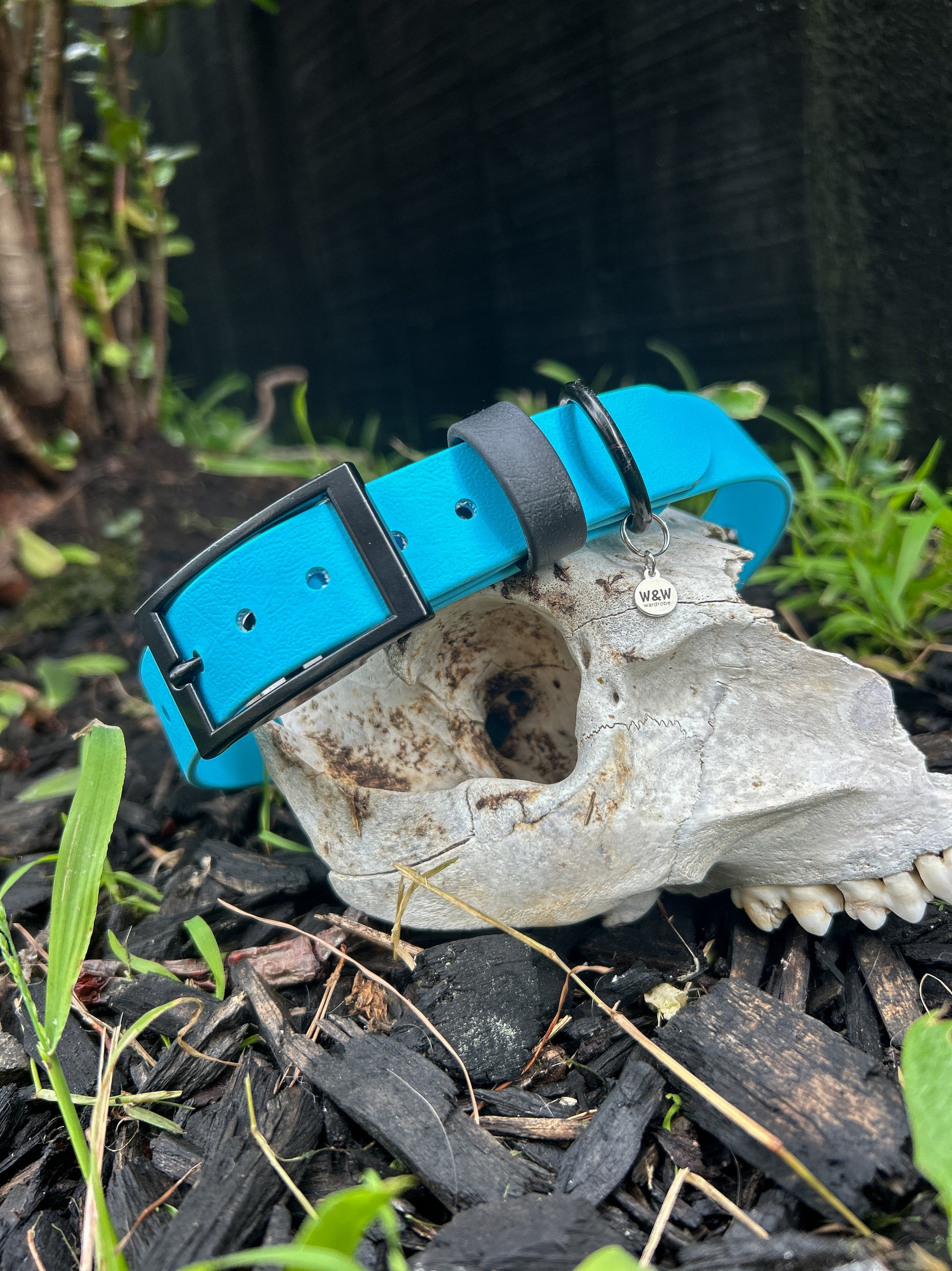 1" collar – ice blue Biothane, black hardware, black Biothane feature band with eerie milky gems – Large 42–54cm