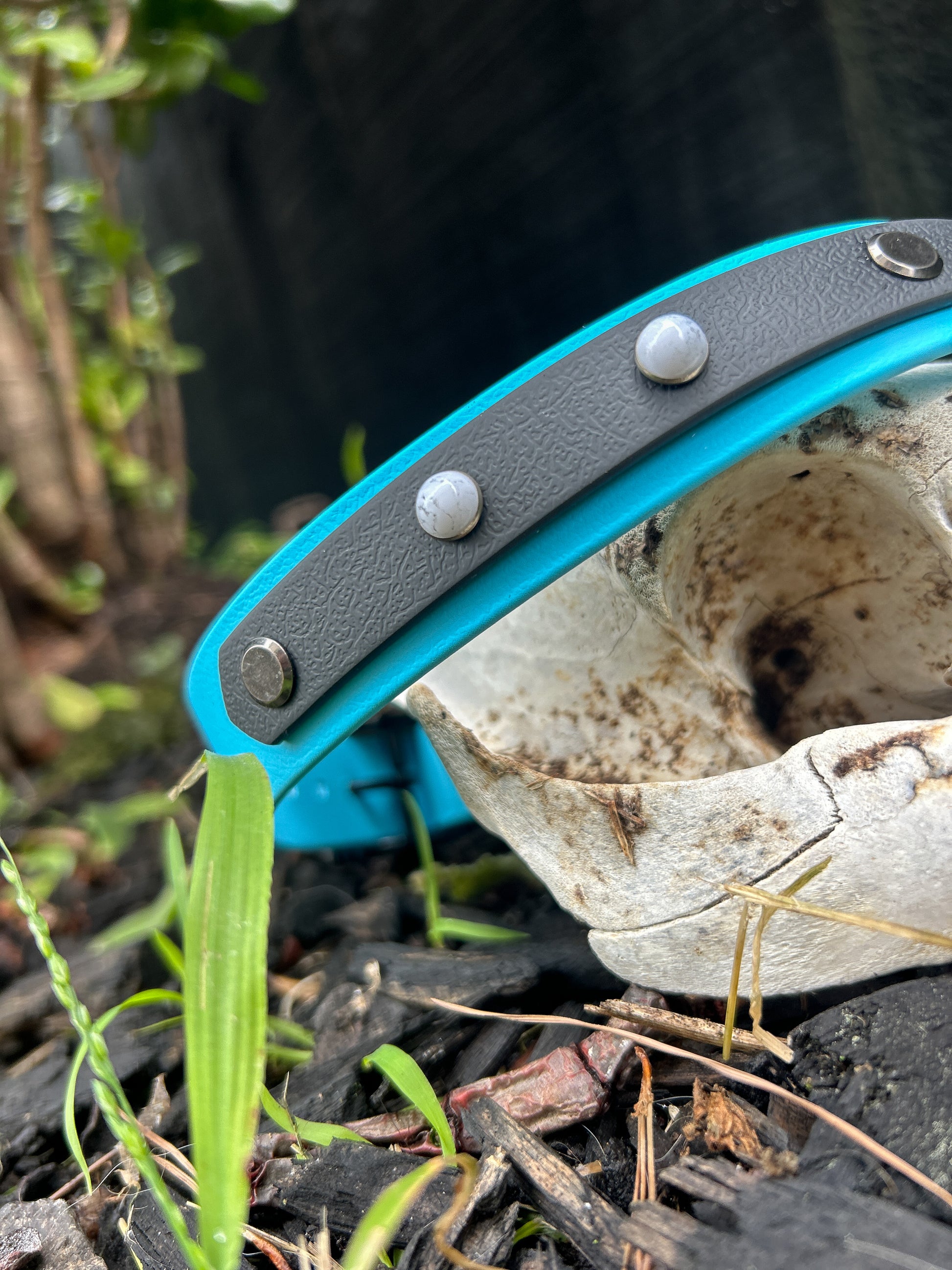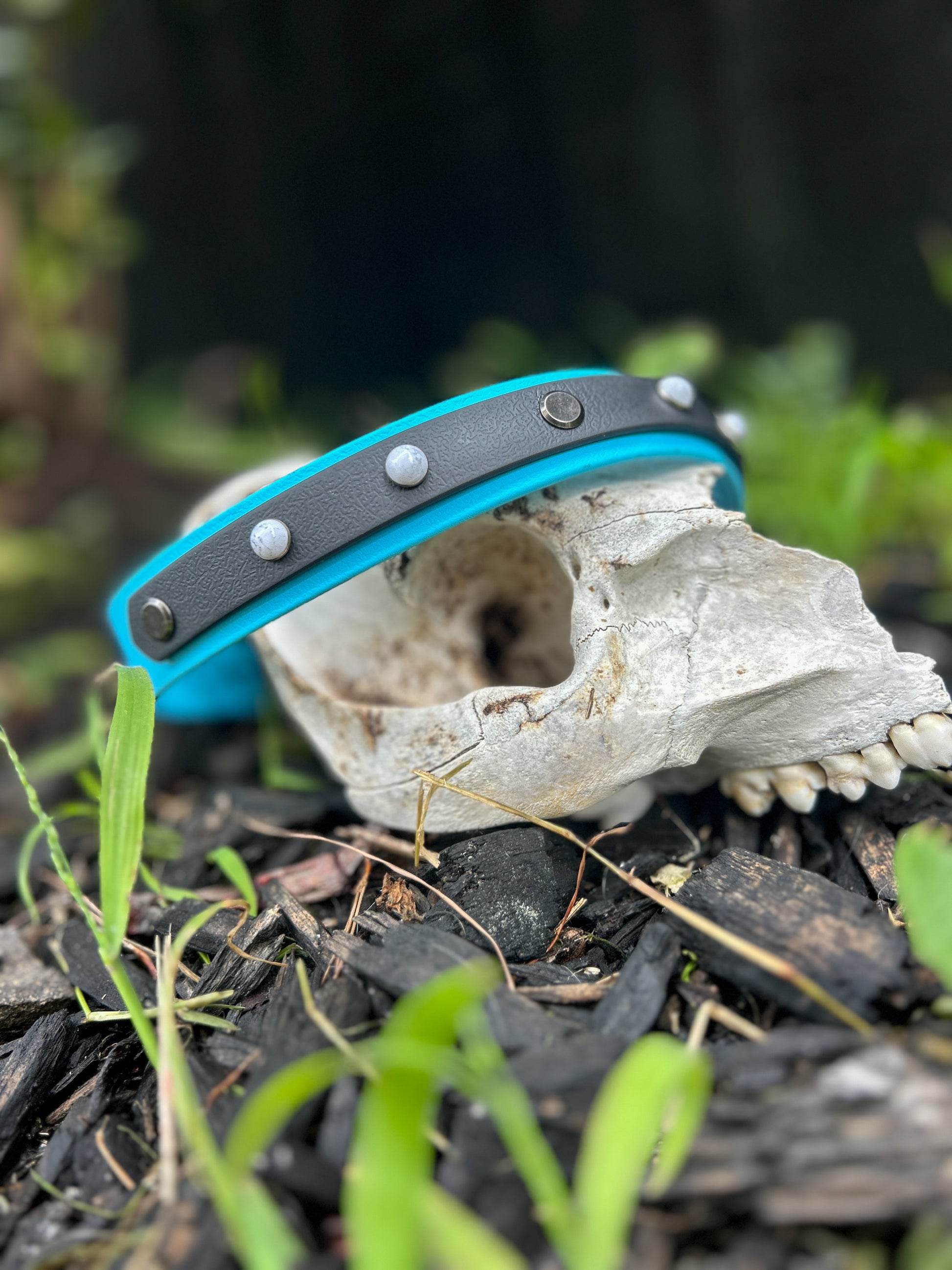 Cold clarity. A collar that cuts through with eerie precision — ice blue Biothane, a black overlay, and ghostlike milky gems that seem to watch back.