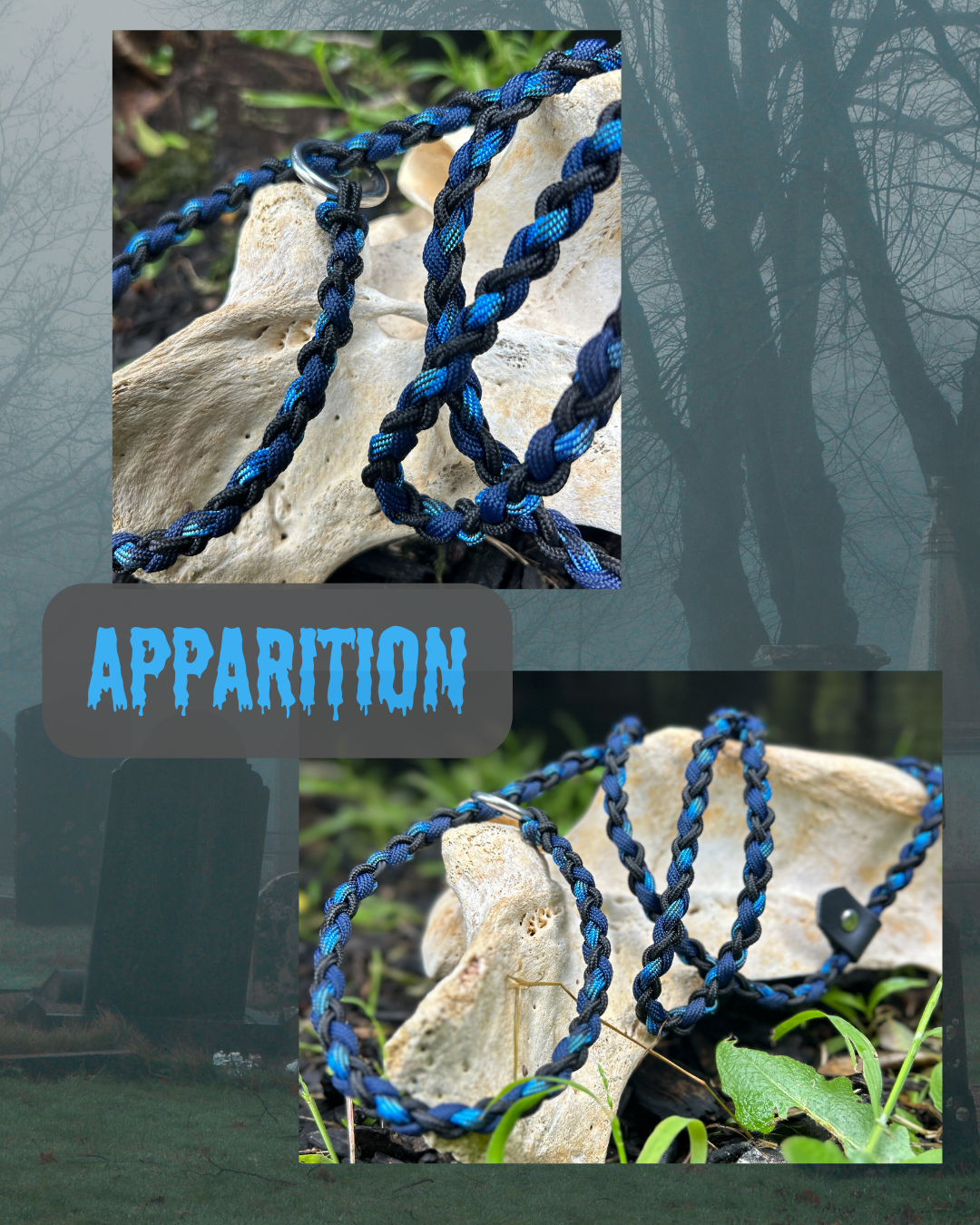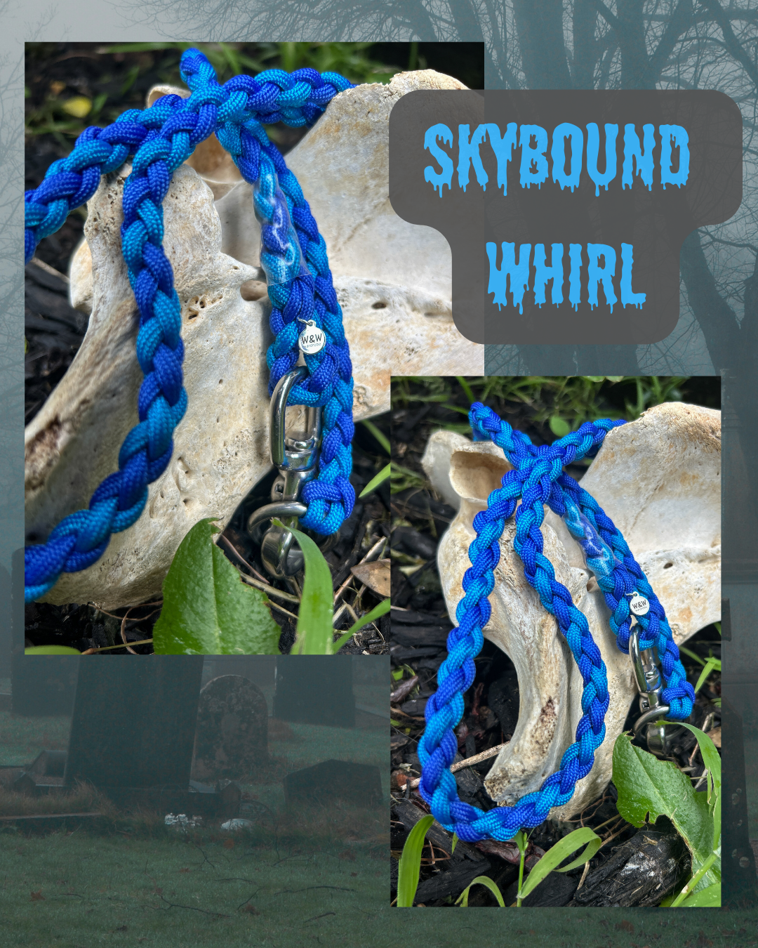 1.4m slip or clip lead, or across body strap– sky blue & blue paracord – spiral pattern, O-ring at one end, clip at the other.