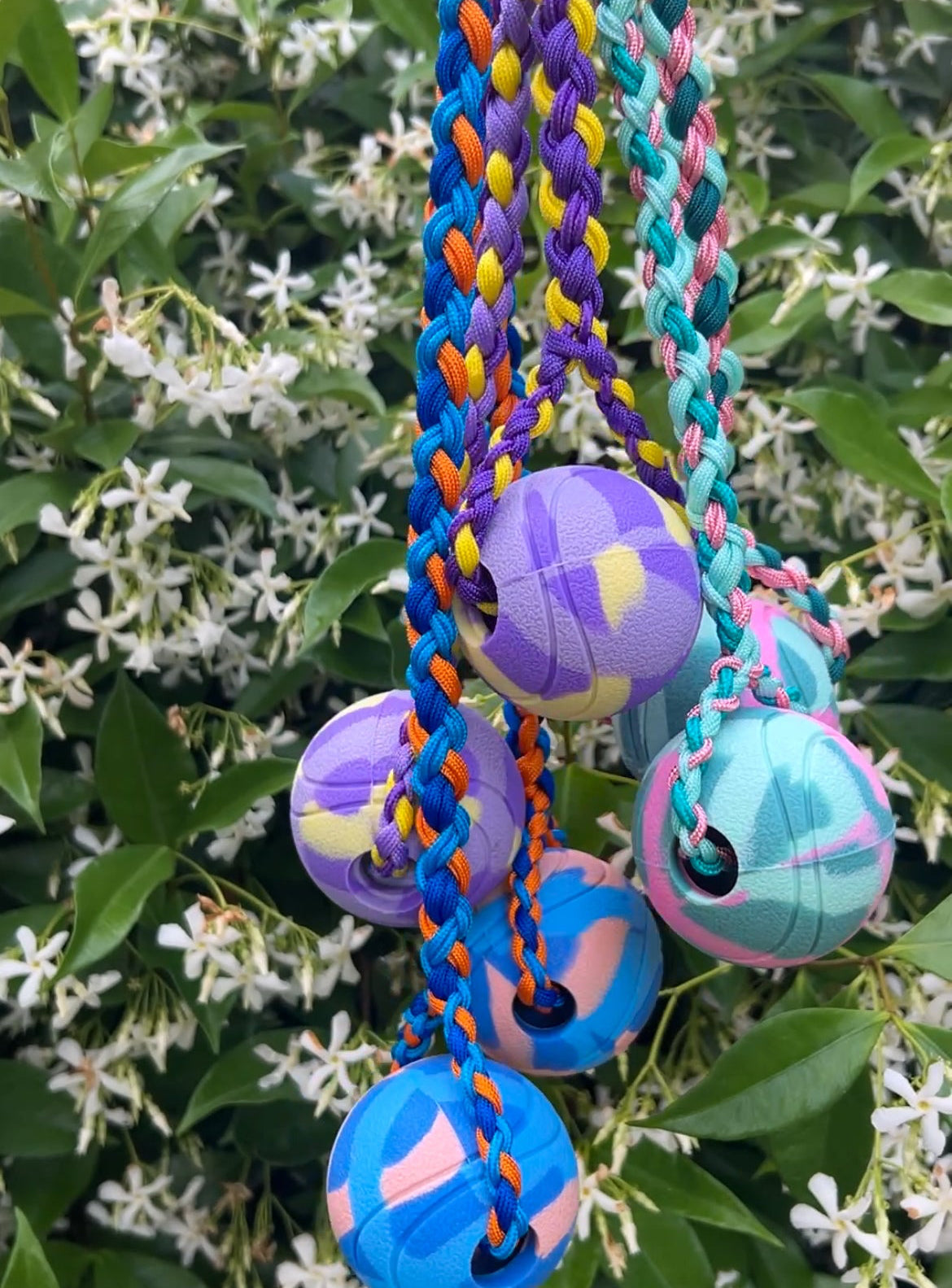 This one’s all attitude. A thick paracord braid running the full length, landing in a chunky 7 cm ball built for chomp-happy jaws.