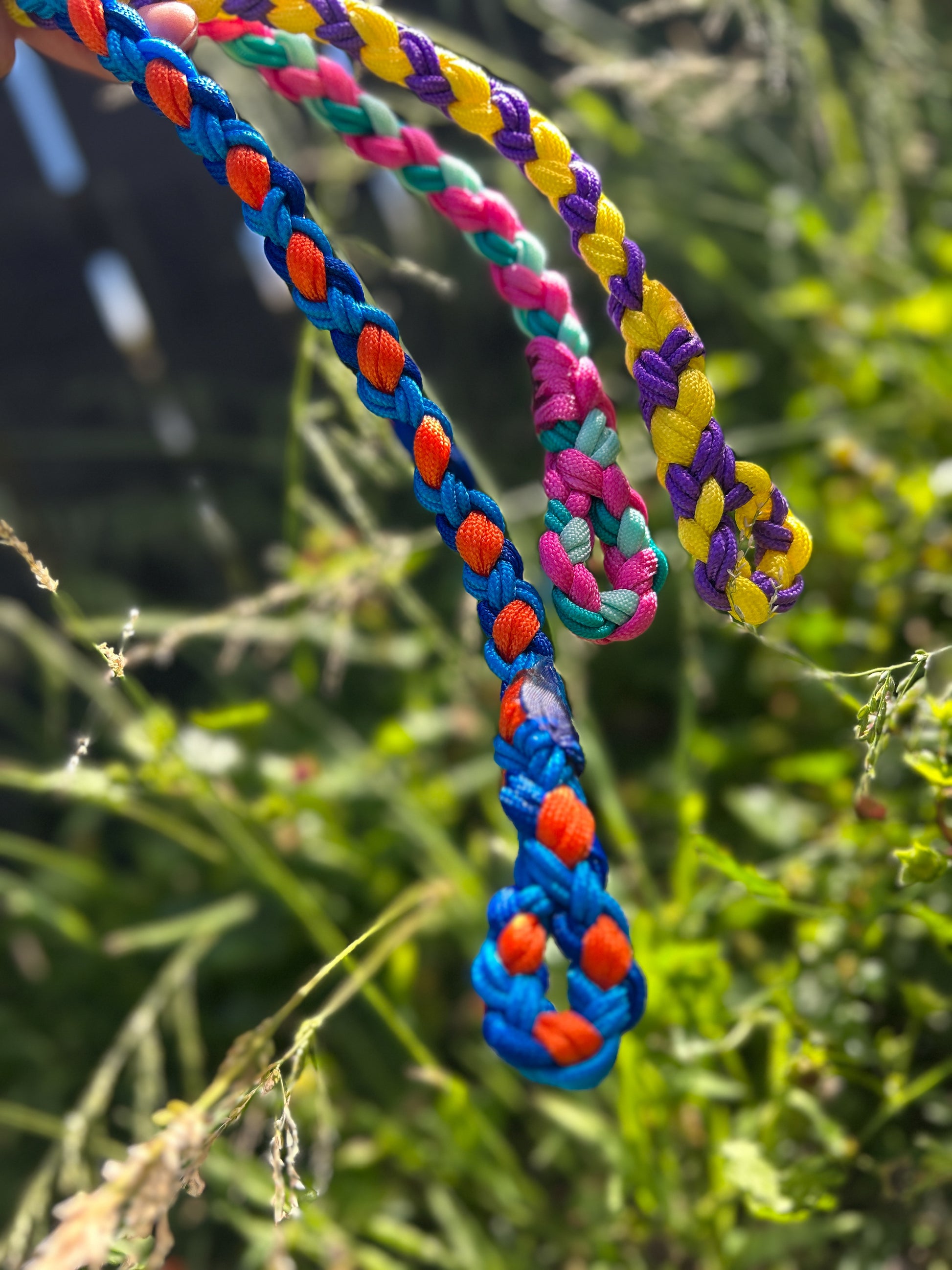 A cleaner, slicker beast. A strip of BioThane runs up the centre, woven with a single colourful paracord line and topped with a grip-stopper that keeps your hand exactly where it should be when your dog launches in like a guided missile.